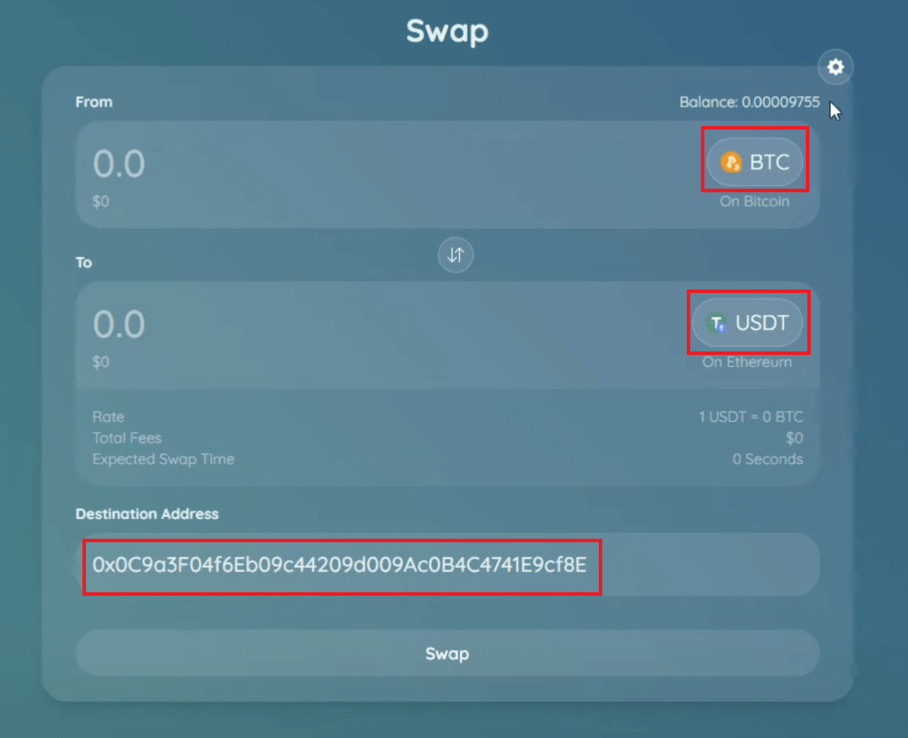 - Select the cryptocurrencies for your trade. You want to swap from Bitcoin (BTC) to USDT on Ethereum.