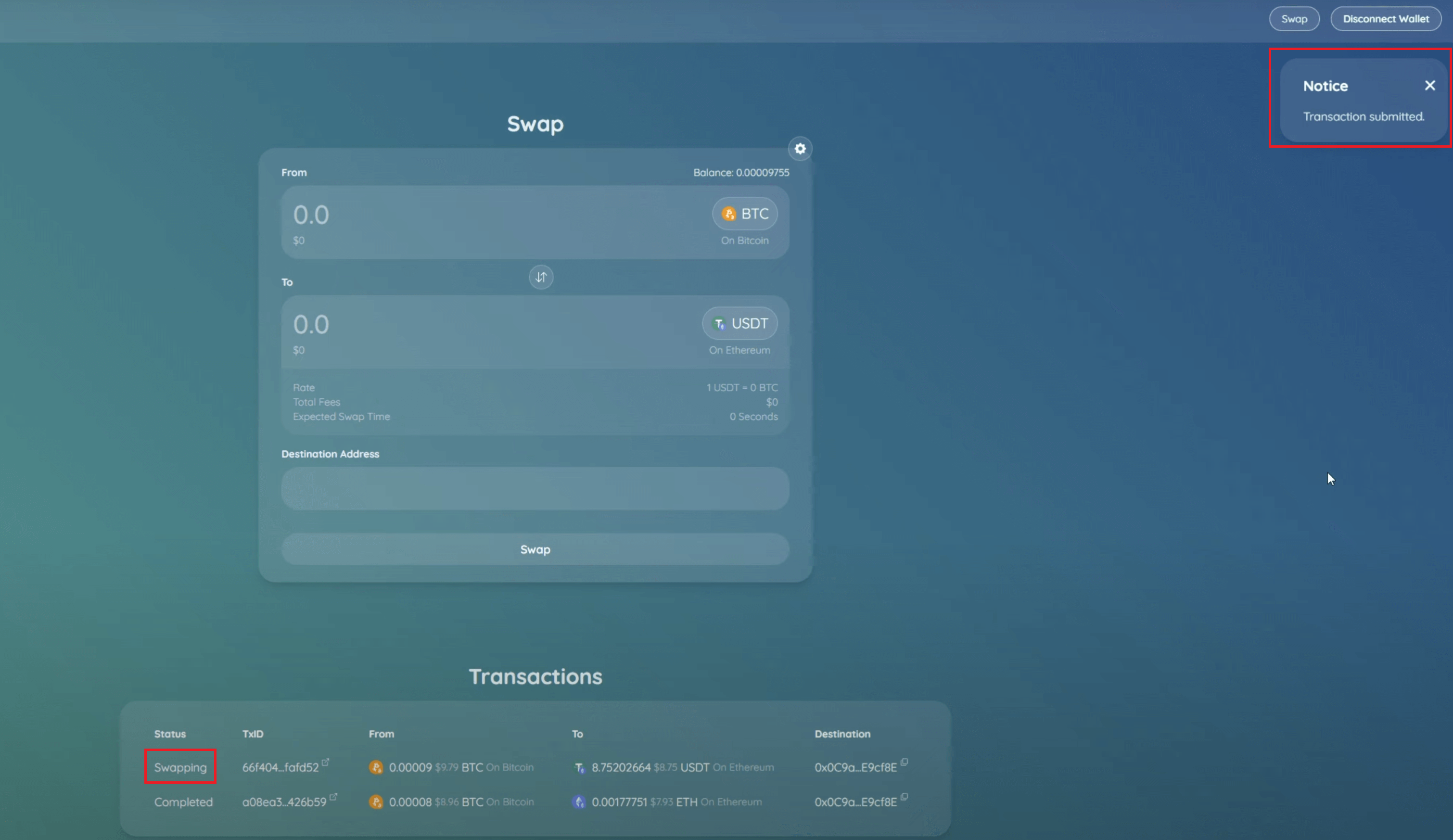 - After confirming, you will see a Transaction submitted message, and the swap has started.