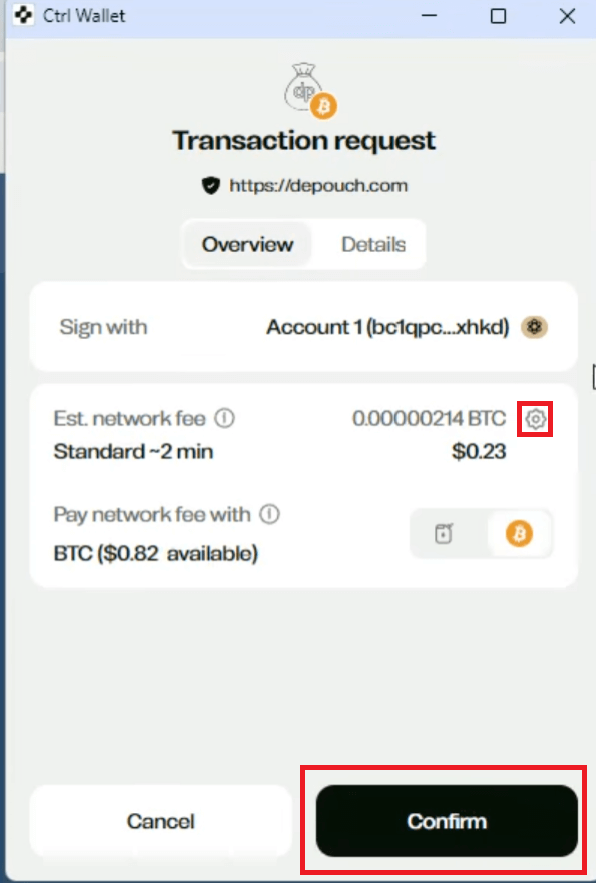 - In your Ctrl Wallet, when prompted to confirm the transaction, find the option to adjust the fee. See image below and look for the tiny red square around the wheel.