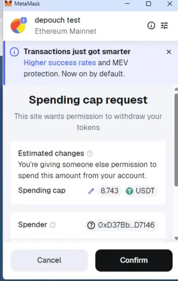 - After the approval transaction is submitted, a second MetaMask pop-up will appear to send the USDT. Click Confirm again.