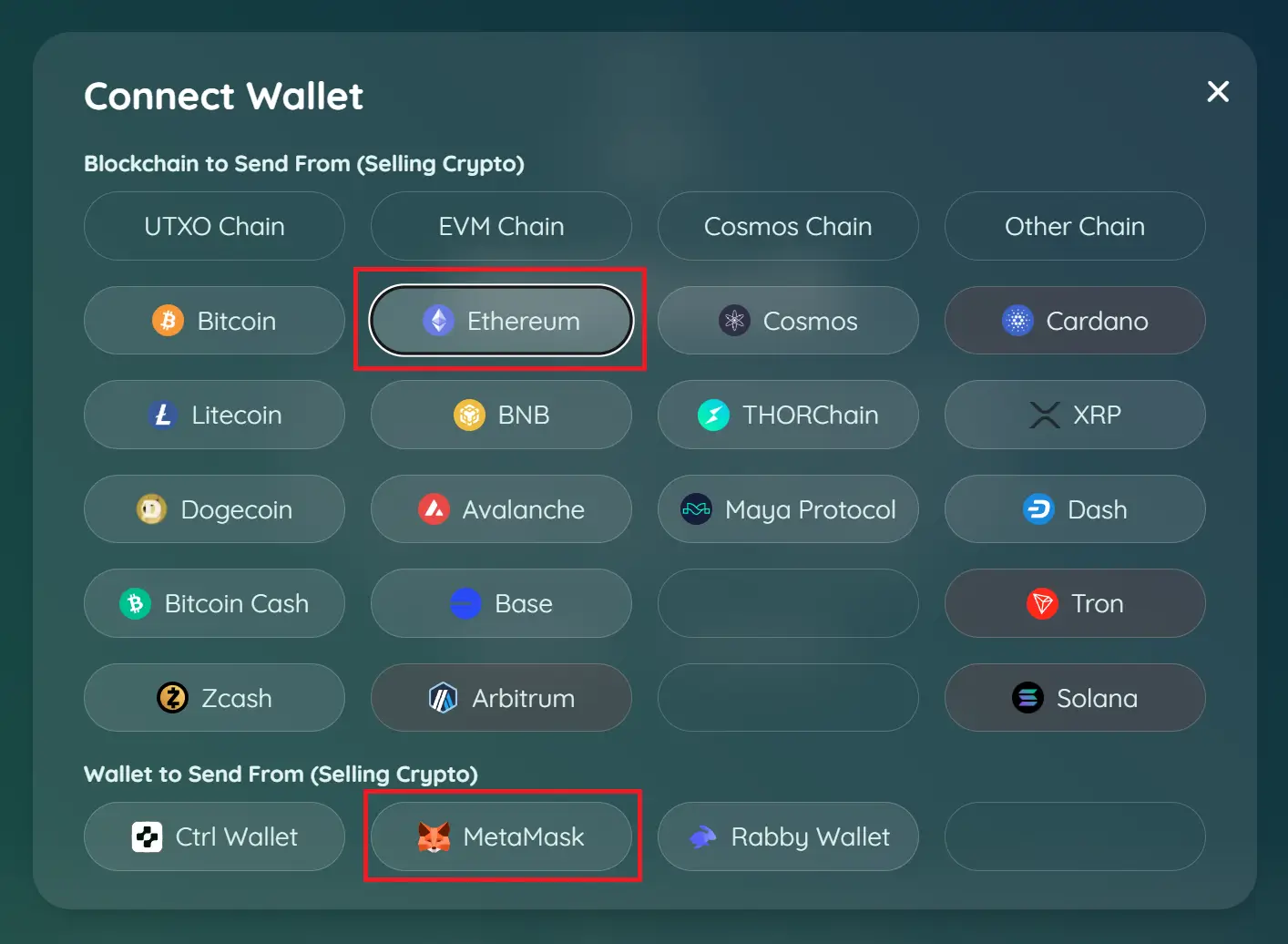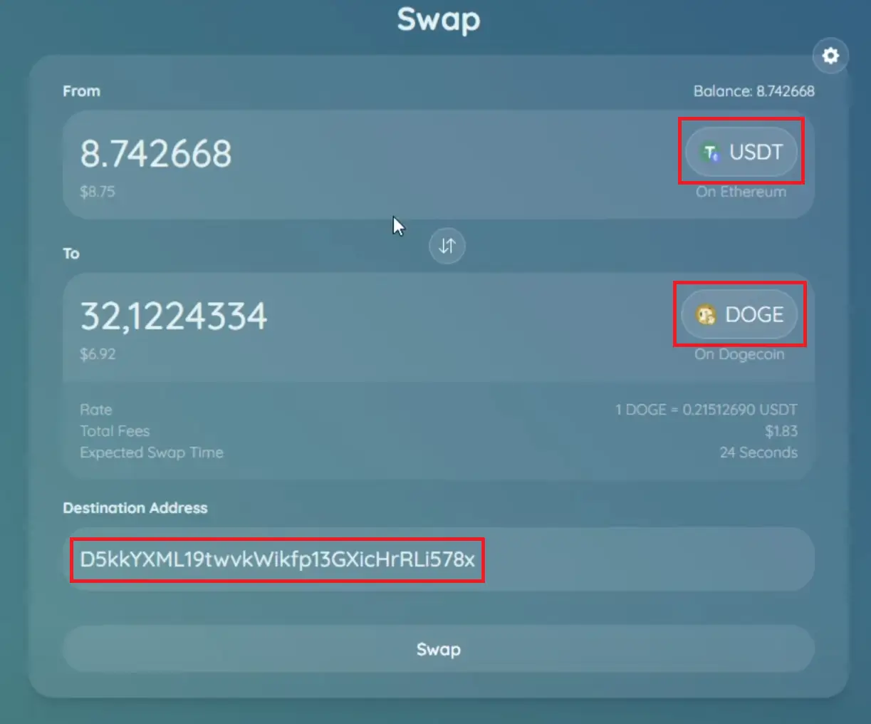 How to trade USDT on Ethereum to Dogecoin (DOGE) using MetaMask on the best cross-chain DEX.