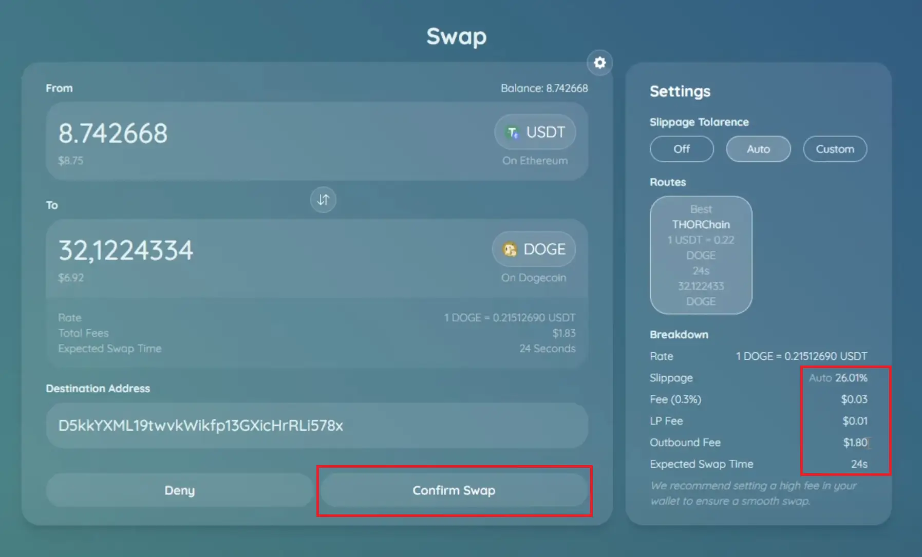 That's it! You have successfully swapped USDT on Ethereum for native Dogecoin on depouch DEX using MetaMask.