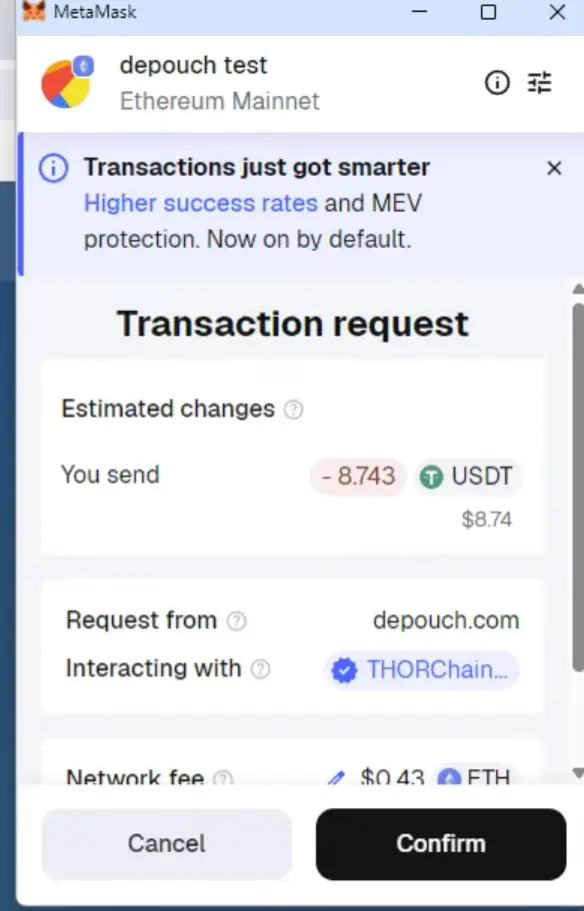 This guide will show you how to trade USDT on Ethereum to native Dogecoin (DOGE) using MetaMask on depouch cross-chain DEX. The process is by purpose simple, allowing you to swap cryptocurrencies without needing KYC or registration