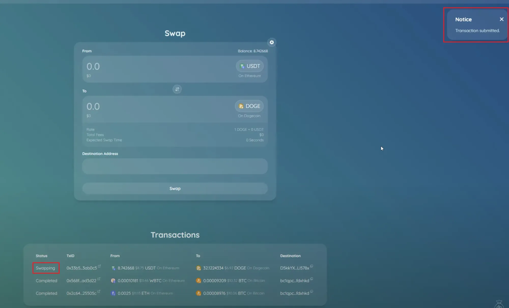 - After confirming, you will see a Transaction submitted message, and the swap status will update on the screen.