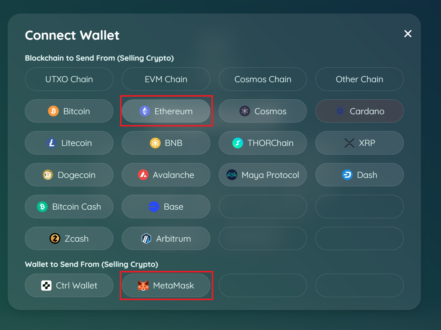 Choose the EVM chain for your WBTC. In this case it's Ethereum, then select MetaMask - MetaMask may ask you to connect. In that case select Connect to proceed.