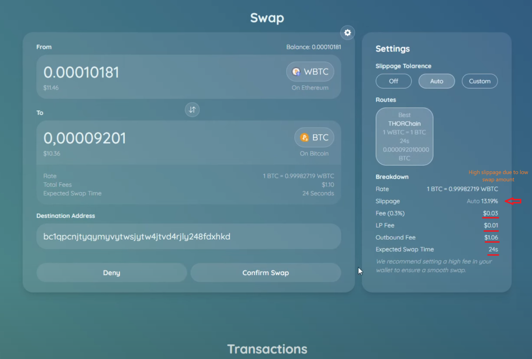 Step 5: After entering the swap details, click Swap. You will see a summary including the expected swap time, and details about slippage, fee, LP fee and outbound fee.