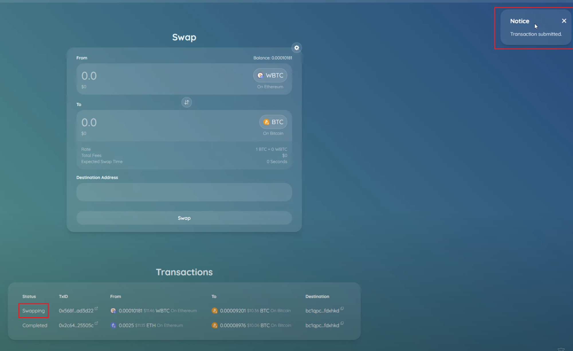 Step 8: Once the transaction is confirmed, the swap will be submitted. You will see a Transaction submitted message. The transaction status will then update as it is being swapped. You can track the progress of your current transaction on the swap page.